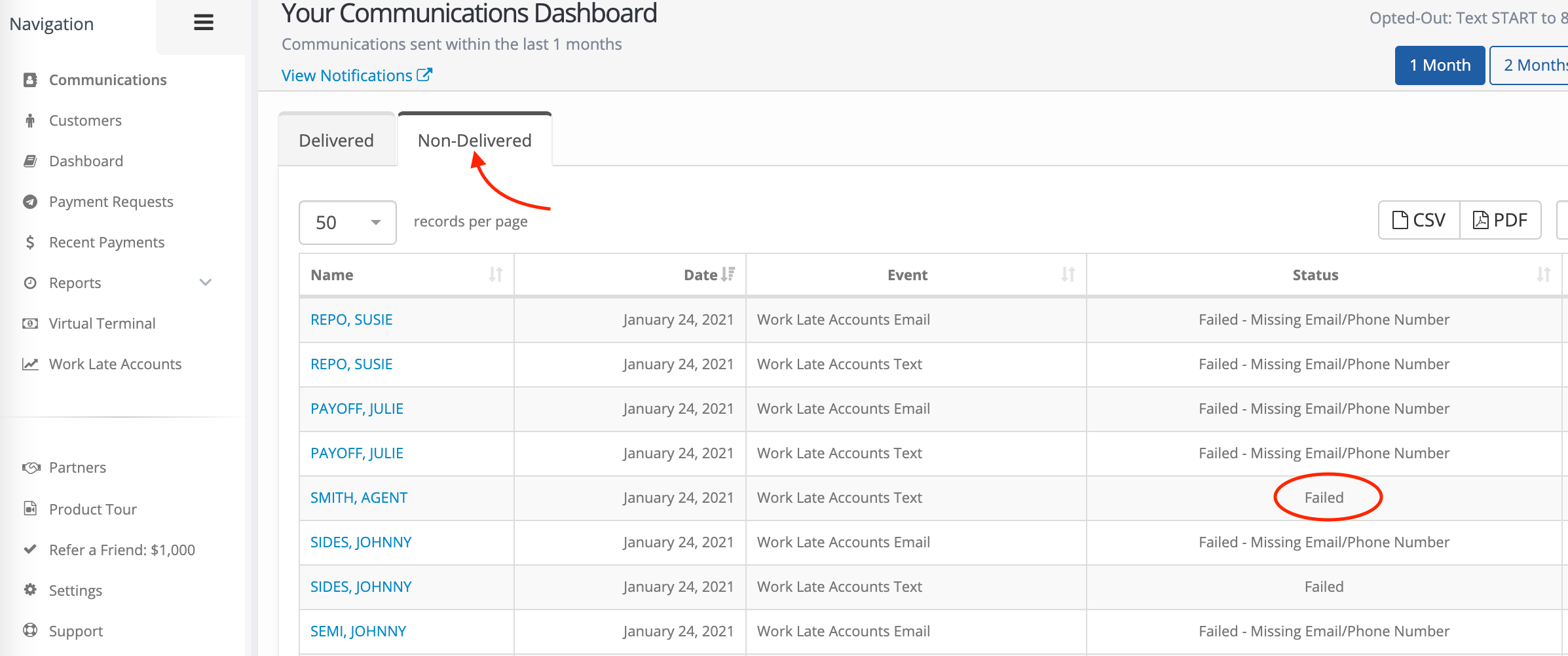 4. Click on the “Non-Delivered” tab to view any text/emails that were not successful